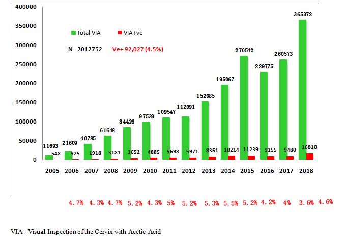 From January 2005 to December 2018, 2012752VIA tests were performed at different facilities; among the tested women, 92037 (4.5%)were found VIA-positive. The coverage of the screening tests is increasing every year (Fig 1).