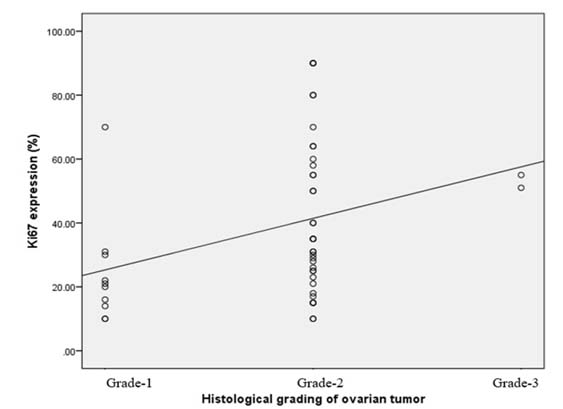 In this study, histological grading had a significant correlation with Ki-67 expression (Figure 1) of patients with ovarian tumor. That means increase of grading causes Ki-67 expression increase. However, Ki-67 expression was also positively correlated with tumor grade in a study by Rajagopal and Ramesh, (2016).