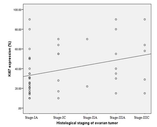 This figure shows Positive correlation between histological staging of ovarian tumor and Ki-67 expression.